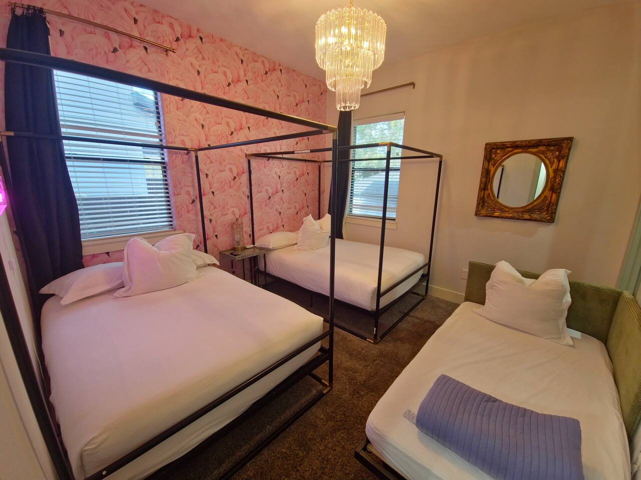 THE SPACE: Bedroom 1: 2 full beds, 1 single rollaway bed, 1 bathroom Bedroom 2: 1 king bed, 1 futon sofa bed, jack and jill bathroom Bedroom 3: 2 full beds, 1 single bed, jack and jill bathroom Bedroom 4: 2 king beds, 1 single rollaway bed, and en-suite bath. Living room: 1 double futon sofa bed Living Area: Open-concept space blending seamlessly into dining and kitchen areas. Dining Room: Seats 8, perfect for family dinners or celebrations. Kitchen: Fully equipped with modern appliances plus a breakfast bar for 2. OUTDOOR OASIS -Step into your private backyard paradise: -Pergola: Flower-adorned for shaded relaxation. -Gazebo: Perfect for morning coffee or evening cocktails. -Hot Tub: Unwind under the stars in luxury. -Alfresco Dining: Spacious setup for group meals outdoors. -Floral Photo Stations: Photo-worthy backdrops for memories. ELEGANT DECOR Inspired by the French countryside, The Bloom House features chandeliers, curated wallpaper, and romantic details that create a serene and refined atmosphere. PERFECT FOR -Large Groups: Comfortably sleeps up to 16 guests. -Special Occasions: Perfrct home to accommodate large groups in town for birthdays, bridal showers, anniversaries, and reunions. -Photography Enthusiasts: Every corner is designed to be photo-worthy. GUEST AMENITIES To ensure a stress-free start to your stay, we provide a complimentary starter pack of essentials such as toilet paper, paper towels, and trash bags. Once the pack is depleted, guests may replenish as needed, at their own expense. PARKING Driveway accommodates 2–4 cars. The gated turf area can fit 2–4 additional vehicles, so you won’t need to park on the street. Please use only designated spaces out of respect for neighbors. WHY GUESTS LOVE IT -Elegant, French-inspired décor -Outdoor hot tub, gazebo, and pergola -Multiple photo-worthy floral walls -Spacious layout for groups and celebrations -Convenient Houston location near attractions, dining, and entertainment See more on our Social: @LuxeStaysHouston