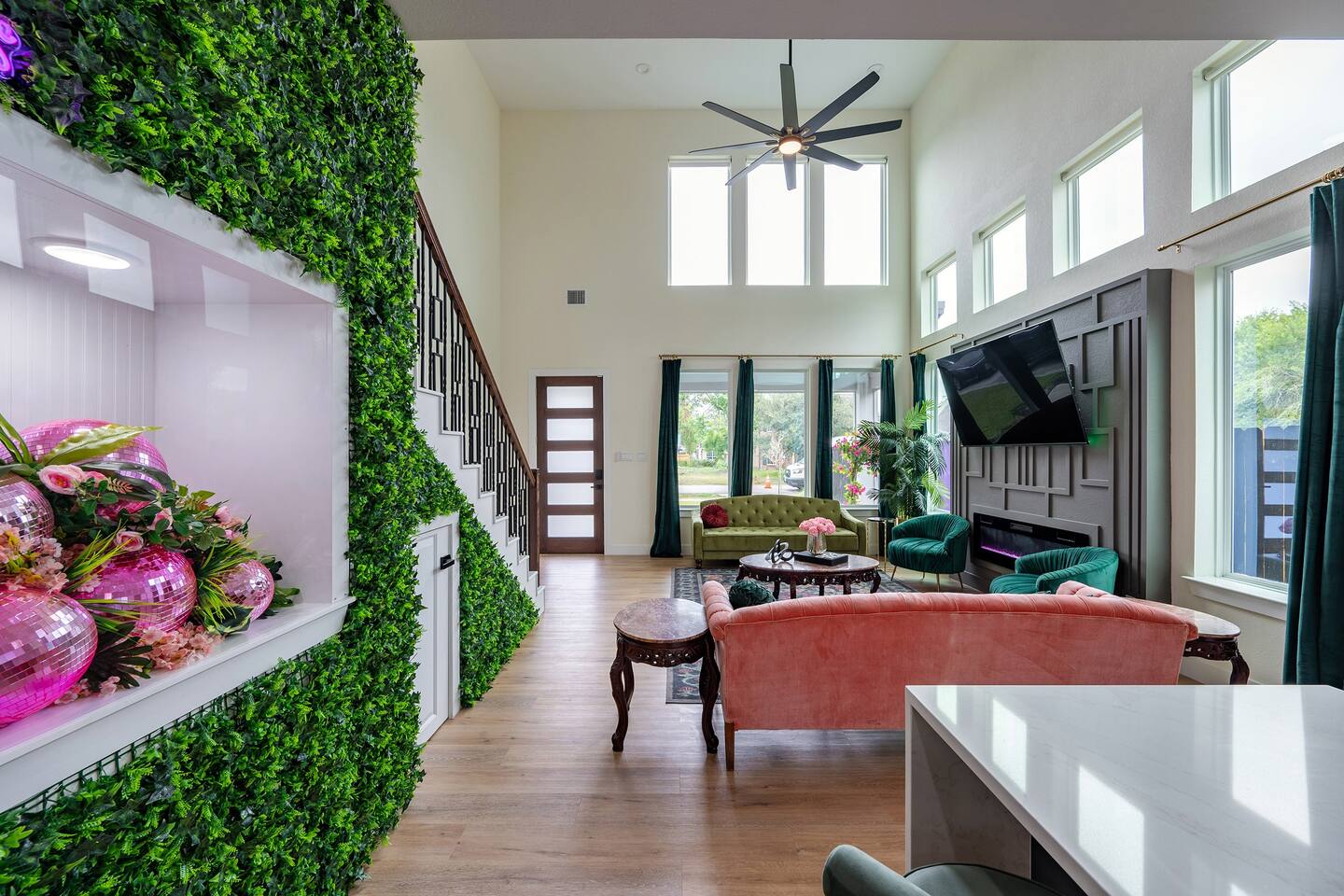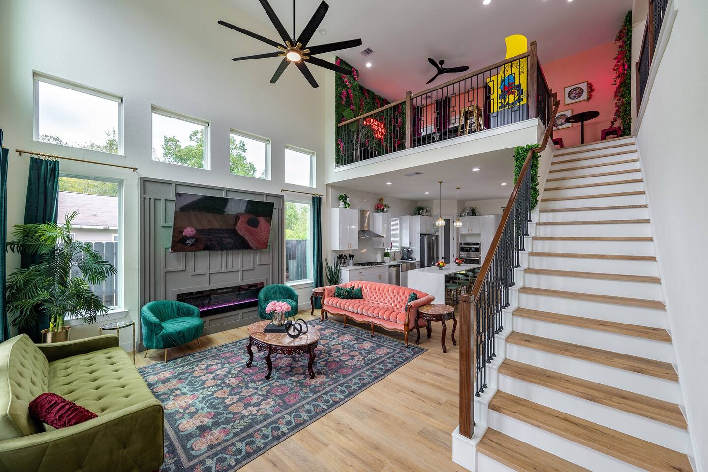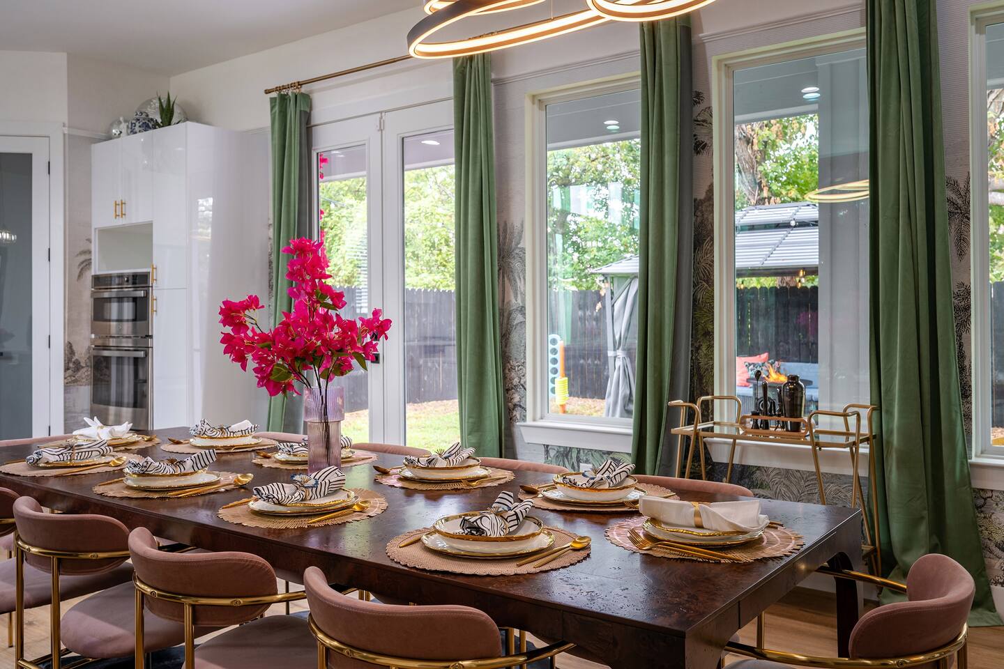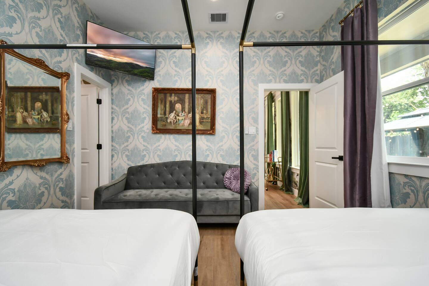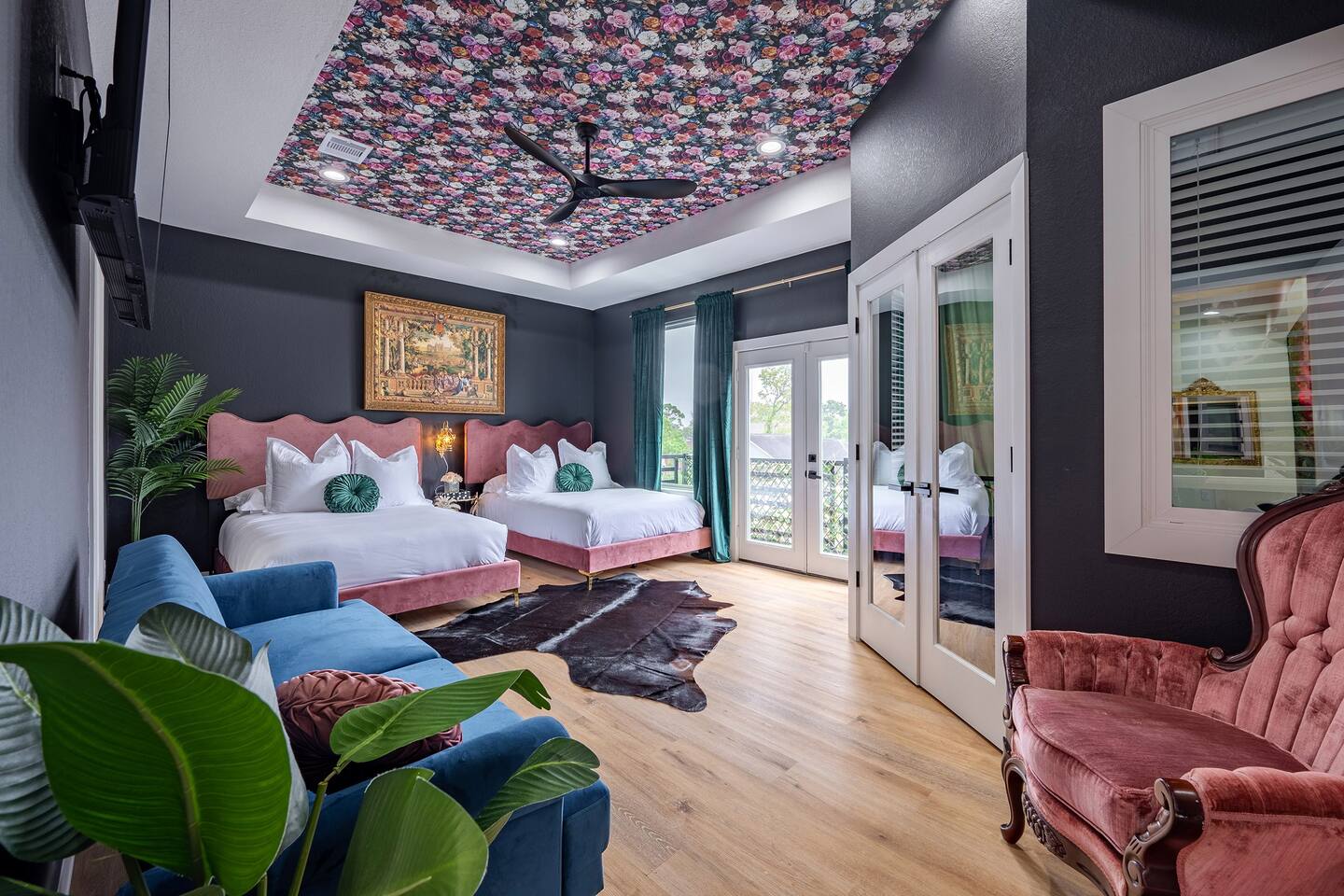 THE SPACE Bedroom 1: 2 Queen beds, 1 futon bed and en-suite bath. Bedroom 2: 1 king bed Bedroom 3: 1 king bed Bedroom 4: 2 Full beds, 1 single bed, 1 double futon bed, 1 rollaway bed and en-suite bath. Living room: 1 double futon bed and 1 single rollaway bed (stored in laundry room). PERFECT FOR ENTERTAINING Enjoy a dining room that seats 10, plus a kitchen island with seating for 4—ideal for group meals, holiday feasts, and special celebrations. ENTERTAINMENT & RELAXATION Challenge friends in the well-appointed game room, then step outside to the spacious backyard featuring a pergola, hot tub, and outdoor dining for the perfect blend of fun and relaxation. CHIC AESTHETIC French-inspired wallpaper, curated décor, and thoughtful design touches throughout create an elegant, welcoming atmosphere. COMFORTABLE ACCOMMODATIONS With 12 beds across multiple bedrooms—2 KINGs, 2 QUEENs, 2 FULLs, 3 futon sleepers, and 3 singles—this retreat sleeps up to 16 guests in total comfort. Each bedroom is equipped with a Smart TV (40–65 inches), making it easy to relax and unwind. PHOTO-WORTHY BACKDROPS Selfie walls with florals and greenery provide perfect photo opportunities, making this home ideal for capturing lasting memories. LUXURY ADD-ONS Customize your stay with exclusive LuxeStays Houston upgrades, including a private chef, décor services, mobile bartender, mixology class, massage, or facial. GUEST AMENITIES To ensure a stress-free start to your stay, we provide a complimentary starter pack of essentials such as toilet paper, paper towels, and trash bags. Once the pack is depleted, guests may replenish as needed, at their own expense. PARKING Driveway accommodates up to 6 vehicles (depending on size), with only 1 spot for parking available directly in front of the home. Please no parking on the grass. Out of respect for neighbors, parking is limited to designated spaces. We kindly request that you note, for security and liability purposes, guest access to the garage is unfortunately not available. We appreciate your understanding and hope to provide you with a pleasant and safe parking experience. WHY GUESTS LOVE IT -Spacious, elegant design perfect for groups -Family- and celebration-friendly layout -Multiple photo-worthy photo spots -Central Houston location near Downtown, NRG, and top attractions See more on our Social: @LuxeStaysHouston